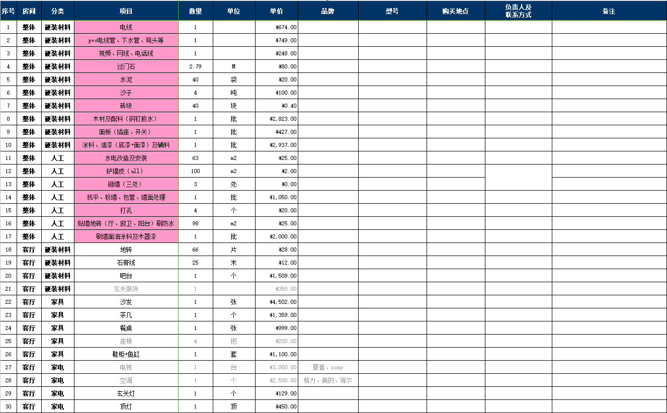 2.单项工程总和。即将各项工程的单项造价逐一算出,然后相加,即木龙骨工程+水电工程+油漆工程+木工+泥瓦工程+泥工+洁具安装+五金灯具,其总和就是总造价。